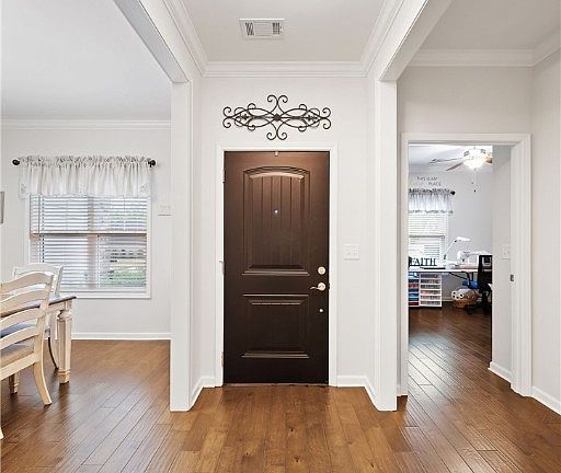 ADA accommodations include a zero-step entry, wide door frames, and a zero-entry shower. 3 bedrooms on the main floor and a bonus room/4th bedroom upstairs. The home has been very well maintained. Beautiful hardwood floors throughout. NO CARPET!!! Natural light throughout the home. There is a large primary bath and laundry room. Large primary shower with frameless shower door, zero entry, bench, and 2 handwands. The kitchen offers a walk-in pantry, double oven, and under-cabinet lighting. The home has irrigation around the house as well. Covered back porch and additional parking pad.