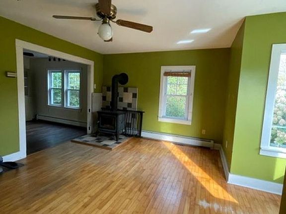 Charming and tastefully improved farmhouse offering a touch of contemporary to the country.... just a 5-minute walk to Lamoille Valley Rail Trail, Covered bridge, Lamoille River fishing and paddling. Enclosed sun-filled front porch. Expansive rear deck overlooking the private back yard with raised gardening beds, fire pit, lots of perennials, shrubs and berries - mature landscaping. Great studio with lots of natural light. An other room suitable for playroom, office, library.....make it your own! Galley-type kitchen opens up to the dining area with vintage built-in cupboard. The livingroom has beautiful hardwood flooring! Spacious first-floor laundry offers enough space for a second bathroom. Hook-up for woodstove. Single-car garage with storage on the back.