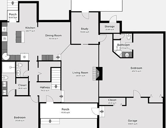 - Patio & porch: Covered, Front Porch, Porch, Screened