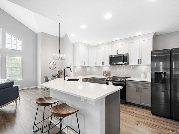 Beautifully reimagined with elevated design and serene surroundings, this end-unit townhome in Bear Valley showcases gorgeous views throughout. Vaulted ceilings and expansive windows fill the open-concept living area with natural light, highlighting a fireplace with updated tile, luxury vinyl flooring, and updated finishes throughout. The remodeled kitchen boasts new quartz countertops, a designer tiled backsplash, and gorgeous new cabinetry — ideal for both everyday living and entertaining. On the main level, a serene primary suite offers views of the adjacent meadow and a luxurious, fully updated bath. Upstairs, a versatile loft with a private balcony provides the perfect space for work or relaxation. The finished lower level adds flexibility with a rec room, guest suite, or a home gym, complete with a full bath, laundry, and access to the large two-car garage. Nestled in a peaceful setting with a trail leading to Peak View Park just beyond the backyard and less than a mile to the Bear Valley Park trail system, this residence offers privacy and a refined connection to Colorado’s natural beauty.