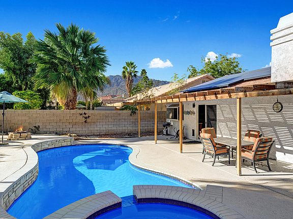 Welcome to Panorama, a very desirable neighborhood w/a strong sense of community, centrally located near everything. This home has everything: the right orientation w/the extremely desirable South Facing premium lot w/ natural sunshine in the backyard, solar (leased), front yard + oversized backyard, your own pool + spa. Perfect for raising a family, enjoying a 2nd home, or a very lucrative income property. This SFH has 3 BDs + Den or Office, a separate desk space, 2 Baths. The Main BD w/an En-Suite updated Bath w/elegant/hip subway tiles, shower over tub, walk-in closet, and direct access to the pool area. All BDs have carpet, ceiling fans and are bright. A spacious living room w/high ceiling, electric fireplace, recessed lighting in the kitchen, pantry, a separate dining area. The huge backyard surrounded by block walls on all sides, has great Mtn views, a private pool & spa, a firepit, natural grass, a covered patio for al fresco dining and lots of possibilities for entertainment. The Panorama Park is just a few blocks away. Walking distance to Elementary, Middle, and High Schools. Shopping all around: Stater Bros, Cardenas, Traders Joes, Vons, Target, Walgreens. Restaurants, Casinos + Movie Theaters are just around the corner. Surrounded by Golf Courses: Desert Princess, Cimarron, Escena, Tahquitz Creek. Minutes away to the hip Downtown Palm Springs, the elegant and chic El Paseo, The Living Desert Zoo. You Own the land. No HOA dues.