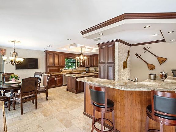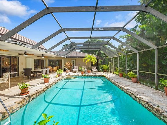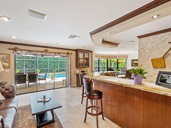 Discover tropical luxury in this Estancia community home. With a thoughtfully designed split floor plan, this residence offers a perfect blend of functionality and relaxation. Step into a world of entertainment and comfort as this home has been renovated to cater to your every need. The gourmet kitchen, featuring double ovens and microwaves, is a chef's dream, providing convenience for hosting large dinner parties. One of the bedrooms comes equipped with built-ins, making it an ideal home office. Outside, the lush tree-lined streets and updated pool deck area transport you to a tranquil tropical oasis. This home also comes with many valuable updates, including exquisite travertine tiles, elegant wood floors, granite countertops, and a wet bar designed for seamless entertainment.