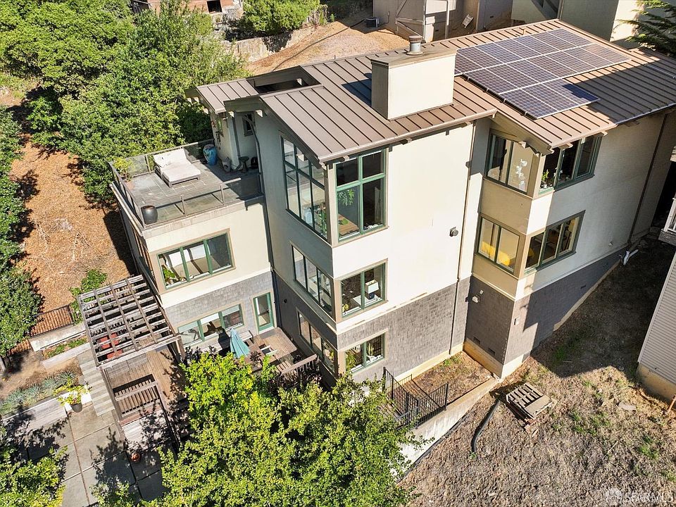 Spectacular, grand home in Montclair Hills! Immerse yourself in modern luxury with expansive rooms spanning 3 levels, covering nearly 5,000 square feet. Gorgeous views of The Bay, San Francisco, and cityscape creates the perfect ambience. Fabulous living room with open-beam cathedral ceilings and fireplace overlooking the stunning view. A formal dining room, walk-out decks; front and back, a separate office and an amazing gourmet kitchen with center island complete the main level. Downstairs (middle) level features a massive primary bedroom suite with views, fireplace, separate office, walk-in closet, amazing private bathroom with dual sinks and huge soaking tub. The bottom level boasts a spacious media/family room and access to the deck and yard. Modern amenities include: Radiant heat, solar panels with battery backup, EV charger, Toto high-tech toilets, loads of storage, and huge decks on multiple levels for lounging, BBQ and enjoying life. Fantastic neighborhood in a private, serene setting with top-rated school. Close to Montclair Village, Shepard Canyon hiking trails and easy freeway access. Truly an amazing home!