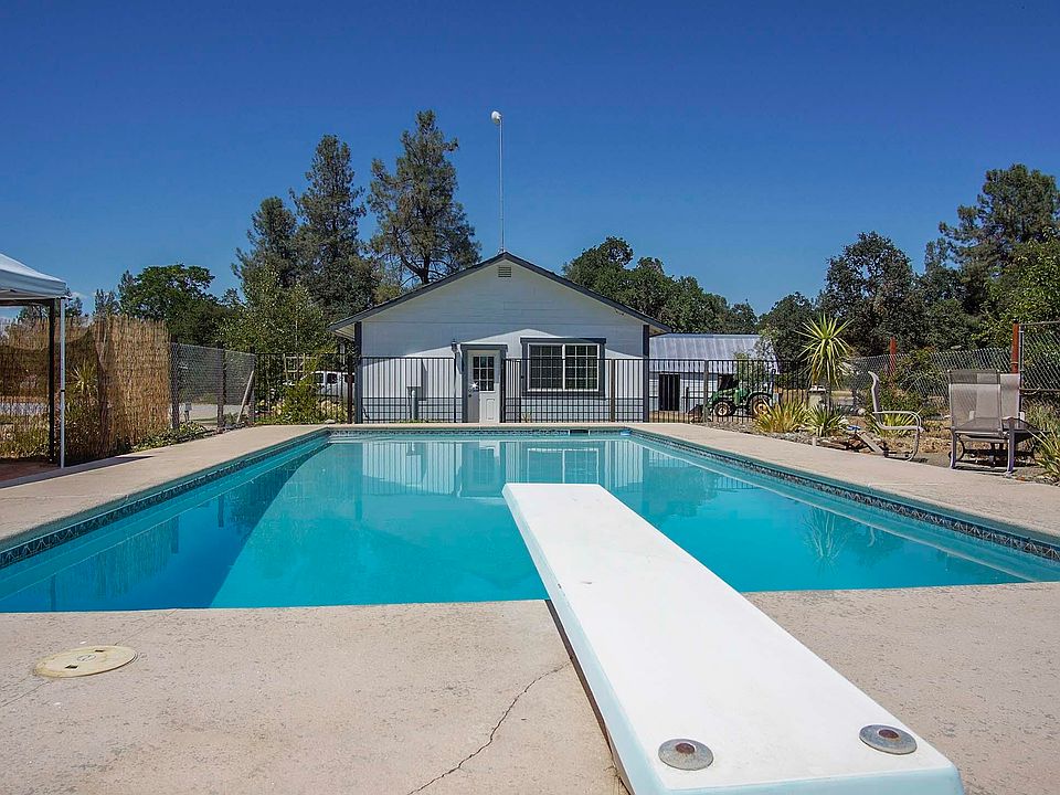 This property previously was pool house which owners have converted to a beautiful home. Totally renovated with permits. It has one bedroom and bath along with laundry room, 936 sf. Attached 1 car garage. Swimming pool, 38X19, was just resurfaced and it's on 2.05 acres, fenced and has a small stable. It's beautifully landscaped with enclosed area for garden and lots of fruit trees. RV hookup. Security system and Shasta Beam is internet provider.Original home burned down.