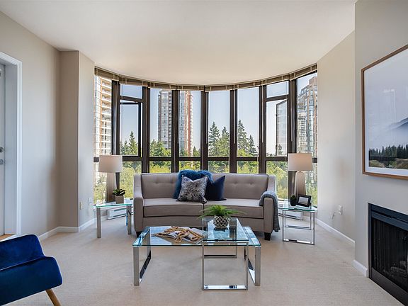 WELCOME HOME TO VILLA JARDIN. This bright, spacious and functional 2 bed + 2 bath home has 9' ceilings and expansive floor to ceiling curved windows with views of the park. Sip your morning coffee or enjoy evening wine on your choice of two south-east facing, private, covered balconies! Absolutely no wasted space in this open concept home; you'll love the large separated bedrooms, each with their own balcony, spacious living room with fireplace, stone countertops and breakfast bar in the kitchen, perfect for entertaining. Villa Jardin at City in the Park is steps to the Edmonds skytrain station, parks and offers resort style amenities including lounge, hot tub, gym and more! Parking/storage included and pets/rentals welcome. Showing by private appointment.