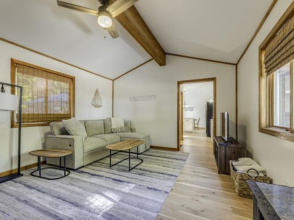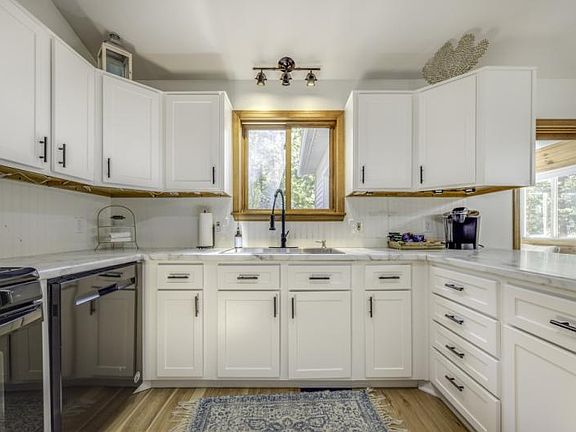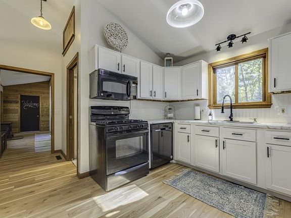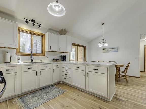 Welcome to your new year-round or seasonal home, a short walk away from beautiful private beach access! This stunning property boasts high ceilings and an abundance of natural light, creating an inviting and spacious atmosphere. Enjoy new kitchen cabinets and flooring throughout, complemented by fresh paint that enhances the home's bright and airy feel. An additional cozy sitting room with a fireplace provides a perfect spot for relaxation. A door wall leads from the dining area to a lovely 3-season--ideal for enjoying morning coffee or evening relaxation. The functional kitchen with new cabinets and a large pantry provides ample storage for all your culinary needs. Three comfortable bedrooms and two full baths, including one featuring a double vanity and unique hand-painted Caseville-themed tile, add a touch of charm. Nestled among mature trees, the home also has an outdoor patio and firepit for your enjoyment. The property features a convenient circle driveway and an attached 2-car garage. Located within walking distance to town and the famous Cheeseburger Festival, this home combines beachside living with community charm. Don't miss out on this incredible opportunity - schedule your showing today!