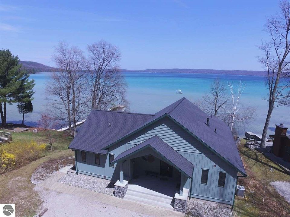 Magical turquoise & blue Big Glen Lake views are captivating from the minute you enter this terrific, 2009 custom built home. The floor plan works perfectly for families large and small with two kitchens, two master suites & two living/dining rooms. Enjoy entertaining, family gatherings and evening's glow from the elevated deck or spacious walkout deck below. Smart layout includes 4 bedrooms, 3½ baths, 2,828 finished sq. ft., a gas fireplace plus a lakeside garage/storage space for all your summertime gear. The delightful 100' waterfront property has been meticulously maintained with a large lakeside yard & room for a fire pit & outdoor games. Simply stated - here's a jewel of a property on the rare gem we call Glen Lake!