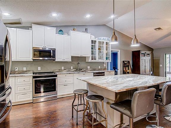 This warm and inviting single story, 3 bedroom, 2 bathroom home has seen major upgrades. The kitchen has been remodeled by way of granite counters throughout, a new oversized eat at island, new stainless steel appliances, custom fixtures, and has been completely opened to dining and living spaces. A rare wood burning fireplace anchors the living space accented by massive vaulted ceilings inspiring feelings of relaxation. In the master suite, the vaulted ceilings carry on where you'll find the remodeled master bath equipped with dual vanities, plank tile, two skylights, and a gorgeous and spacious stand up shower. With the exception of the bathrooms, lovely waterproof laminate has been installed throughout. The exterior of this home has seen improvements as well with new windows and doors, screened in lanai in the rear, and patio in the front. Mature trees provide shade accompanied with a privacy fence giving you your own little oasis.