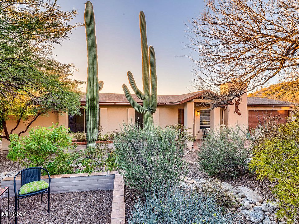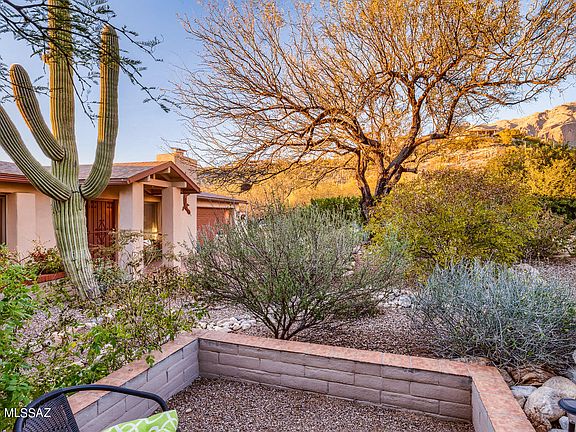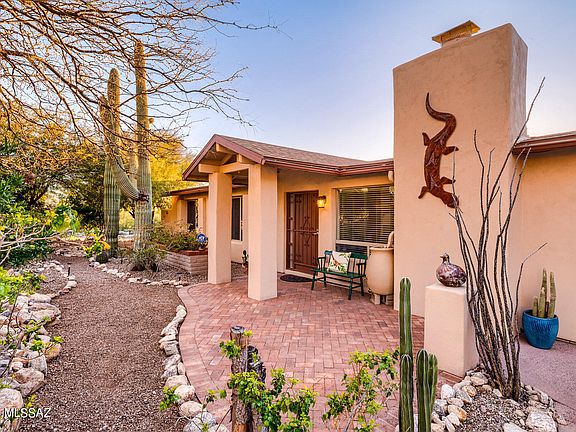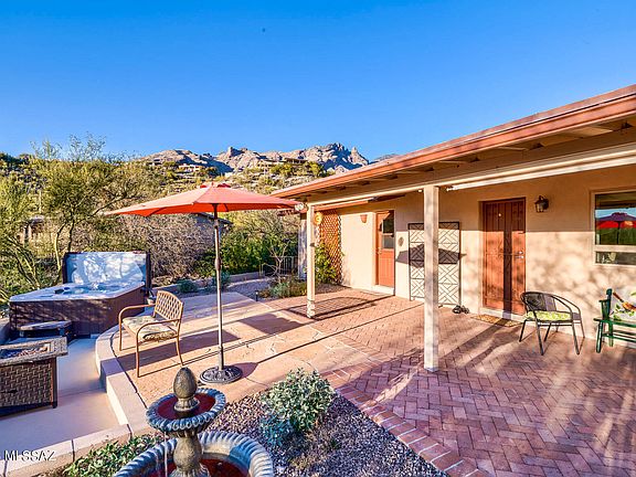 Gorgeous little respite from the static of life, this home is nestled on a corner lot, surrounded by lush vegetation, morning sun on the Catalinas, colorful sunsets and desert wildlife strolling through a rear wash. Enter a great room brightened by lots of light, mountain views and warmed by a wood-burning fireplace. Indoor amenities include a 3 yr old stainless kitchen appliance package of fridge, range, DW and Microwave/Convection oven. Central island, corian counters, and beautiful cherry cabinetry throughout the home. The master bedroom has a large sitting addition with its own patio, and two extra bedrooms offer mountain views. Ceramic tile thruout, except owners' suite. Patios front and rear, and a separate quiet spot in front, for mountain viewing with morning coffee. (click ''more' Hot Tub and fountain added with electricity in 2018. Extended length Garage with workbench and shelving; and aggregate concrete driveway. Rooftop Solar Panels - owned, not rented - keep TEP bills WAY down.