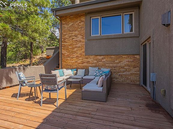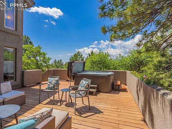 Nestled in the prestigious Rockrimmon neighborhood of northwest Colorado Springs, this captivating raised ranch embodies the essence of mountain luxury. This meticulously remodeled 4-bedroom, 3-bathroom residence offers a sanctuary of elegance and modern comfort. From the moment you enter, the home welcomes you with intricate brickwork and graceful arches, bathed in natural light that floods through high vaulted ceilings and oak floors throughout. The heart of the home is a gourmet kitchen, meticulously updated with top-of-the-line appliances perfect for creating culinary delights while enjoying sweeping views of Pikes Peak. Each room offers a unique perspective of Colorado's natural beauty, with expansive windows framing panoramic vistas that change with the seasons. Step outside onto the new decks and breathe in the crisp mountain air as you relax in the hot tub, surrounded by lush landscaping and gentle lighting that transforms the backyard into an enchanting retreat. The 1-acre lot, densely treed and backing onto open space with natural rock formations, ensures unparalleled privacy and serenity, making it a haven for both relaxation and entertaining. State-of-the-art Lutron Caseta lighting system and Google Nest smart home technology, seamlessly integrate modern convenience with the home's timeless charm. Cozy up by one of the three fireplaces as you watch the sun set behind the majestic mountains. This home is not just a residence; it's a retreat, a place where modern luxury meets the rugged beauty of Colorado's landscape. Whether you're enjoying a quiet morning coffee on the private terrace off the primary suite or hosting friends and family for an evening of starlit dinners on the dining terrace, every corner of this property tells a story of comfort, sophistication, and the unparalleled allure of Rocky Mountain living.