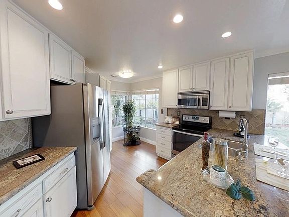 Beautiful end of cul-de-sac home, well maintained & updated. Wood floors throughout, fresh paint, crown molding & wide base. Kitchen with granite counters, stainless appliances, lots of cabinets, breakfast bar between kitchen & family room. Large trex deck 23x14 off upstairs bedrooms for sunning & gorgeous view of hills & surrounding area. Fantastic kid friendly neighborhood. Wonderful neighborhood has community pool, spa & play area. Best San Marcos schools. DO NOT DISTURB TENANTS OR WALK ON TO THE PROPERTY. Tenant responsible for water and electricity. Owner pays for trash and landscaper.