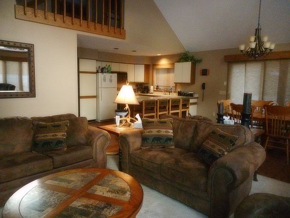GOLF FRONT HOME This spacious, open floor plan, stone fireplace, vaulted ceilings, large deck offers the perfect turn-key vacation home. Currently set up as a family cottage, golf getaway in a rental program. Located On the 4th green of the Michaywe Pines course. Lot located on next lot available for sale.