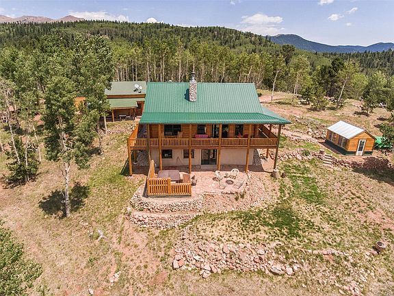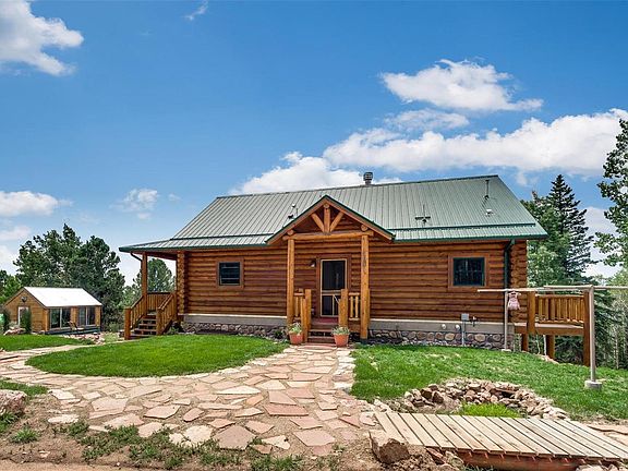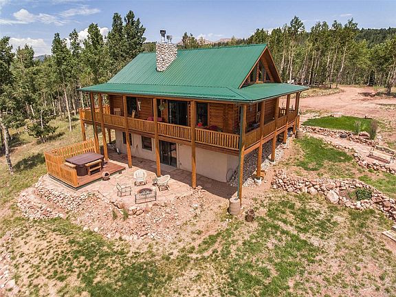 WOW!! An incredible property featuring a custom log home with metal roof and wrap-around porch. 360 degree views of the Sangre de Cristo mountains and valleys. The surrounding aspens give you all of the seasonal colors you can imagine. The inside has incredible upgrades like Red Oak floors, hickory cabinets, stainless steel appliances, and two wood burning fire places. The layout and windows offer views from nearly every room. This 35 acre property borders BLM and boasts rolling hills, open meadows, and mountain living at its best. The property has been incredibly maintained and shows true pride in ownership. The seller had the home built and put a lot of thought into layout and comfort, so you are getting a true custom log home. With this amazing mountain location you will definitely get incredible wildlife sightings, like deer, elk, and hummingbirds. Gold Camp is a plowed road, and you are only 6 miles from Cripple Creek.