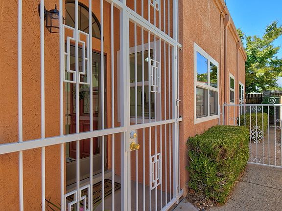 Welcome to this delightful 3 bedroom townhouse! The well-designed floorplan provides a spacious living area with fireplace, separate dining room and sunny breakfast nook. The primary bedroom has separation from the other bedrooms. The 3rd bedroom with French glass doors could be used as an office/study or den! Upgrades include wood plank flooring, replacement windows, and newer skylights. You'll love the easy-care yards, and large private covered back patio. 2 car garage is freshly painted and includes storage cabinets! Refrigerated A/C. Washer and dryer stay! Incredibly convenient northeast heights location, with nearby shopping and restaurants, and easy access to I-25. This is a special house, so don't delay!