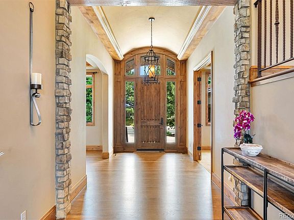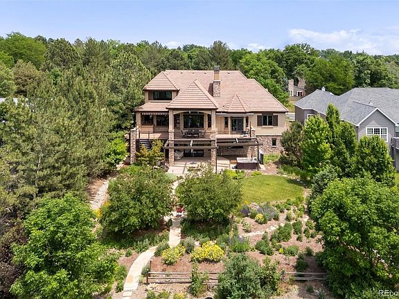 This quintessential Colorado-style custom home offers a relaxed sophistication and offers an unparalleled setting for living & entertaining. Nestled within the coveted, tranquil community of Littleton, this residence sits on nearly an acre, backing onto the Lee Gulch Trail—a segment of the Highline Canal Trail System. Outdoor enthusiasts will relish in the proximity to the Mary Carter Greenway, leading to the scenic South Platte River. Stepping inside, the knotty alder woodwork, extensive hardwood flooring and high ceilings set the tone for refined comfort. The great room with an open beam ceiling and a striking stacked stone fireplace, seamlessly connects to the chef-inspired kitchen equipped with top-of-the-line appliances, granite countertops, and a sizable center island, adjacent to the serving pantry. The primary suite on the main floor is a luxurious retreat, featuring a spacious sitting area with a gas fireplace and access to the deck overlooking the manicured gardens. You will love the generous, primary bathroom & the furniture grade, customized walk-in closet. The main floor is complete with an additional bedroom ensuite, a large laundry room, a well-appointed study and a formal dining room. Upstairs there is a private guest suite with a balcony and walk in closet. You will find this fully finished walkout basement features 3 additional bedrooms and a theater room along with the family room with wet bar and gas fireplace where you can walk right out and relax in the hot tub or sit by the firepit overlooking the expansive backyard sanctuary year-round. This outdoor space features an expansive covered deck with a beautiful iron staircase, retractable awnings, sunshades, a misting system to keep cool. You'll cherish this custom home, amazing outdoor living spaces and 4 car garage.