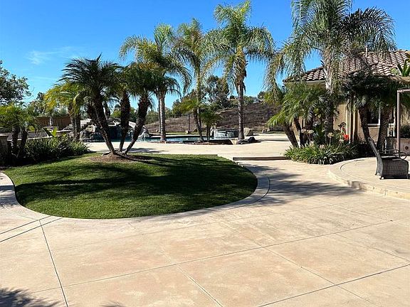 Swimming poolPalm treesTravertine floorGreen gardensHigh ceilingsOpen floor planOutdoor chimney