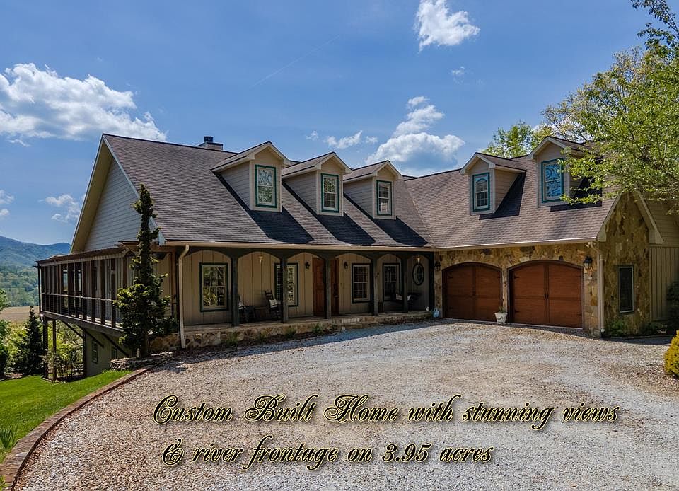 STUNNING, CUSTOM BUILT, LUXURY, 5 BR, light-filled home with Gorgeous Southern Mtn. & pasture views. This property has 180 ft. of Little Tennessee River frontage where you can take the trail down to the river and enjoy the water. It has over 5000 sq. ft of living space on 2 levels & sits on almost 4 acres of privacy in a desirable neighborhood close to town. The living room has tray ceilings, a gorgeous, stone, gas log FP & a wall of windows that open up to a screened-in porch that is great for entertaining. You will love the gourmet dream kitchen that boasts a High-End Darcor 6 burner range with a new Thermador Vent hood, granite countertops & an island w/ breakfast bar. This opens to a sunroom where you can enjoy your morning coffee while taking in the views. The primary BR with ensuite bath, 2 more BRs, 1.5 baths, & laundry rm, round out the main floor. There is a bonus room over the garage too. The finished basement makes a great in-law suite as it has a full kitchen, living room, sunroom, office, 2 BRs, 2 baths, screened-in porch, laundry rm, mechanical rm, & a workshop with a golf cart garage. New Bosch CH&A, & new interior paint are just some of the recent updates.