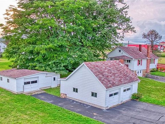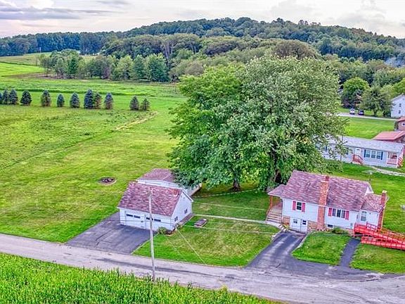 Charming 2 bedroom home in the country on almost 3 acres. Level yard with a 2 car detached garage and an additional garage/building for a work shop or turn into a horse stable. Home needs some TLC but is spacious and waiting for you! Eat in kitchen with stove and refrigerator included. Built in cabinet in the kitchen too! Living room has a large window letting in natural sun light and at one time had a wood burner. Wood burner upstairs has been removed but the chimney is still there. 2 bedrooms and full bath and an extra smaller room off the living room. There is a large walk up attic and full walk out basement. Oil, forced air heat and 2 wood burners in the basement.
