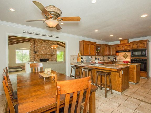This lovely 3BR/3BA on approx.5 acres home was remodeled in 2012 & offers a 1200 sq ft shop & a beautiful in ground pool that was recently rebuilt with new tile, plaster, decking, sweep & filter. It offers all w/new paint, carpet & crown molding throughout. This home has a formal living and family room as well as formal dining. The kit has new appliances, granite & an island w/storage. There are decorative blinds w/full valances tastefully throughout the home. There are 2 wood burning fireplaces, one that has been converted to gas for easy use. The LR has a granite hearth w/mantle & the FR offers a full length brick hearth also w/a mantle. There is a 5 ton HVAC that was replaced in 2000 along w/a 30 yr new comp roof, also in 2000. There are dual pane windows, pocket screen doors for the evening breeze and exposed beams in the FR w/vaulted ceilings. The home is on a fully monitored alarm system & the shop is also alarmed however not monitored. There is a private sitting area of the MB.