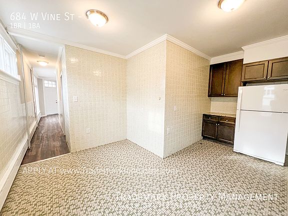 684 W Vine St This spacious 1st floor apartment is ready to be your new home today! It has hardwood floors, a spacious kitchen, a nice en suite bathroom and bedroom, and much more! $50/adult to apply. Tenant pays for gas and electric and a $45/month resident benefit package (includes renters insurance, pest control) Min 600 credit score, good rental history, and 2.5x rent/income