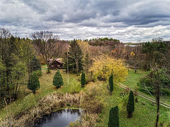Your Private almost 50-acre retreat awaits (46.6 acres but 50 sounded better)! This original owner custom 2BR Log Cabin was built as a year-round home in 1982~ Set WAYYYY back from the road with a large deck that overlooks the front side of the partially cleared lot with a small pond~Large eat in kitchen~Four Season room with huge windows that flood the space with natural light~ Open staircase to the primary bedroom that overlooks the great room with wood-burning fireplace and Natural Stone hearth~Full Walkout basement~Hot water baseboard heat with newer Dnkirk boiler~Newer water heater~ Newer roof estimated 2010~24x40 pole barn with two bays (One oversized)~ Additional shed for storage~Welcome Home!