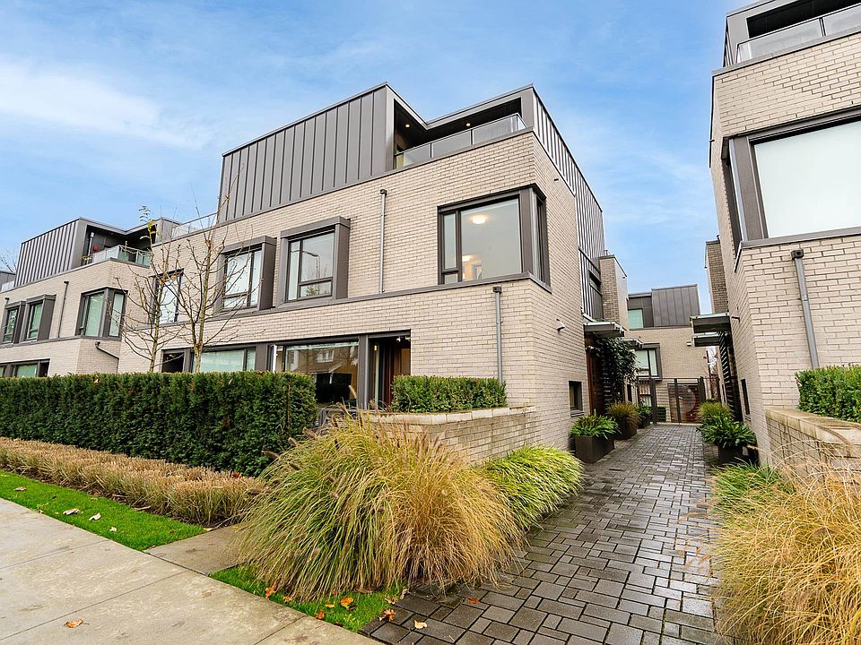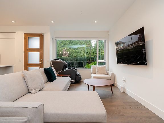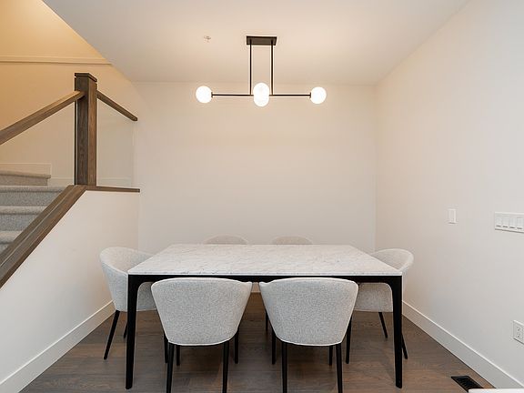 This beautifully designed 3-bdrm townhouse is perfect for growing families. Open-concept living space is paired with gourmet kitchens featuring premium Bosch appliances, making it effortless to relax, entertain, & enjoy daily living. Engineered wide-plank hardwood flooring and expansive windows create bright, inviting interiors with abundant natural light throughout. All bdrms face west, offering exceptional sunlight, & the primary suite includes spacious outdoor balcony with partial mountain view. A versatile lower-level flex room provides the ideal space for mini office or extra storage. Heat pumps with smart Nest thermostats ensure year-round comfort. Located in a highly desirable family-friendly neighbourhood, just short walk to David Lloyd George Elem. & Sir Winston Churchill Sec.