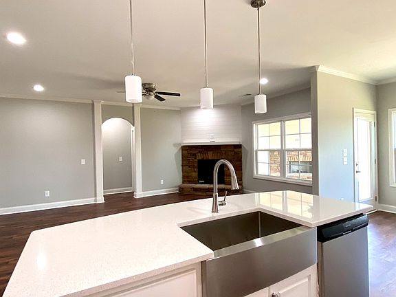 The Honey Springs floor is a 2-story split bedroom plan with the master on the main level, wainscoting from foyer to the family room with an 11 ft ceiling which opens to the kitchen with a large island, farmhouse sink, tile backsplash, under cabinet lights quartz/granite, pantry, large breakfast area with door to patio featuring a wood burning fireplace with cable connection, drop zone with cubbies, recessed lighting, 2 other bedrooms on the main level, wood tread staircase, loft space at the top of stairs, an additional bedroom and bonus room upstairs.