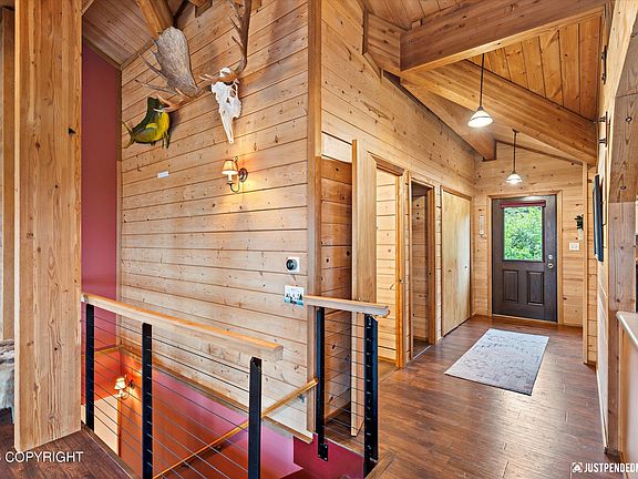 This eco-friendly home is nestled at the top of Potter Heights with it's main living on the top floor to take advantage of panoramic inlet and mountain views. The home was custom built to be extremely energy efficient with laminated engineered logs, a metal roof, and in-floor radiant heat to ensure cozy warmth throughout the colder months.The open concept floorplan is accented by post and beam construction, metal cable railing on the stairs, and laminate wood flooring throughout the upper floor. There are three spacious bedrooms including the primary with its own en-suite and private deck access with tons of evening sun and a hot tub for enjoying those cool nights outdoors, plus a full guest suite on the bottom floor. Located adjacent to Chugach State Park with its many trails and recreational opportunities, this property lets you experience the best of both worlds: the comforts of a modern home combined with the ambiance of a rustic cabin in the woods.
