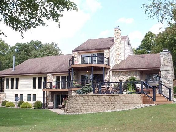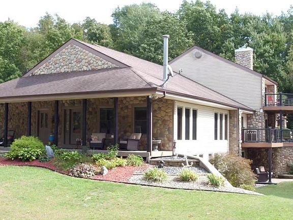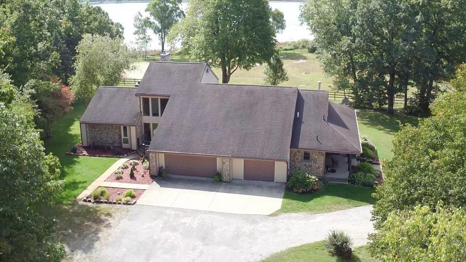Take a drive down the lane to this amazing setting. From the time you wake up you won't want to leave the cozy atmosphere. This unique property provides room for indoor or outdoor activities, water sports or animals lovers. Enjoy the ambiance while utilizing the many exterior spaces not limited to a covered deck, hot tub, waterfall pond, stone fireplace & covered porch. Once inside you will find an updated kitchen at the center of the home, a view of the water & pasture from every room & the open floor plan quite welcoming. The spacious great room w/ high ceilings & round fireplace is a perfect spot for gatherings. Other features; 2 masters, a bedroom on each level, Lower Level Rec Room, 3 stall attached garage, 2 stall detached & 2 stall horse barn w/ run in shed & tack room. WOW, must se