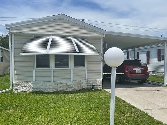 This is a mobile home for sale in a gated, 55+, pet friendly community on a rented/leased lot. Check out this popular split 2BR/2BA model with a 2018 A/C; updated kitchen, bathrooms, laminate flooring and more! The home sits on a perimeter lot with a side set 12 x 20 screened and vinyl lanai with carpet and a shed for extra storage. This mobile home has a living and eat in kitchen area combination floor plan with laminate flooring. The kitchen has laminate flooring, a double sink and ample storage. There are updated white cabinets with a full suite of newer black appliances including a stove/oven/microwave, refrigerator, dishwasher and garbage disposal. The updated kitchen is accented with a modern, white tile backsplash. The living area has laminate flooring, panel walls, a ceiling fan and vaulted ceilings. There is a hallway from the living area to the front set bedroom, with hookups for the newer washer/dryer (included in the sale). The front set bedroom has laminate flooring, a closet and panel walls. The hall bathroom has laminate flooring, a single sink vanity and a shower/tub combination. The master bedroom has laminate flooring, a walk in closet, panel walls and a master bath en suite. The master bath has a single sink vanity and a walk in shower. The carport can park two cars tandem style. The lot rent is $896 and includes lawn mowing, edging and blowing along with the community amenities below. Ridgewood Estates is a well maintained GATED community with 2 heated pools, a hot tub, shuffle board & tennis courts, horseshoe pit, pool side club house with a library, fitness center & billiards room. There is a large "event" center used for many HOA sponsored events. Cards, Bingo, Chair Volleyball, water aerobics....just to name a few! Florida MH Sales, LLC cannot guarantee or warrant the accuracy of this information, measurements or condition of any property. Measurements are approximate. Lot rent is subject to change.