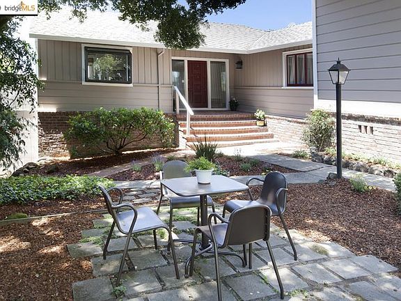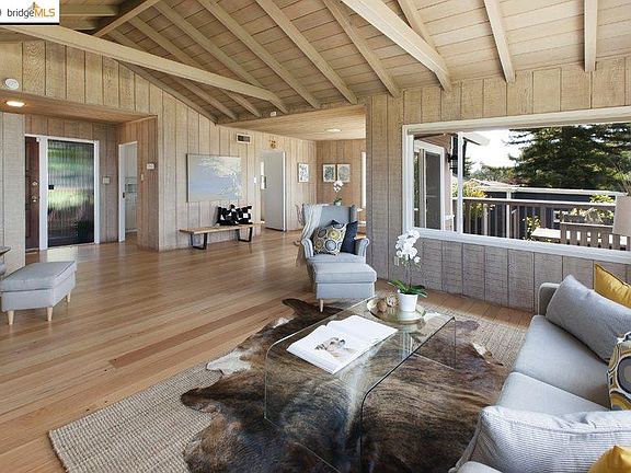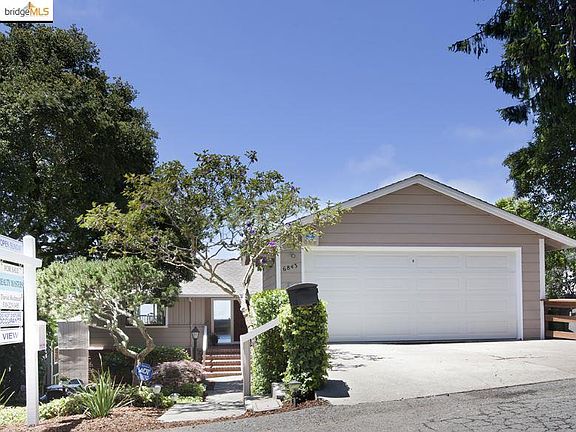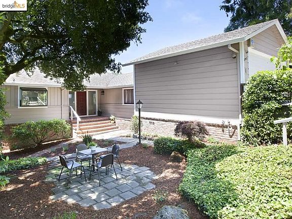 Beautiful Piedmont Pines home with stunning panoramic San Francisco views. This 3+Bedrooms/2Bath home approx 2100 sq ft is set high above the din of the city, literally across the street from the East Bay Regional Park and trailheads. This home offers both a serene park setting and the nearby vibrant community of Montclair. Entering the home you are greeted by an open living and dining room with brick fireplace with beautiful hardwood floors expanding to a new full deck and views. The large windows will draw your eye immediately to the Bay. A bright kitchen looks out to tranquil front garden. Two bedrooms and bath are on same level as living area. The downstairs master suite is complemented with a large fireplace and glass doors leading out to the landscaped rear garden. An additional small bedroom is also downstairs. Configuration may allow for rental potential.
