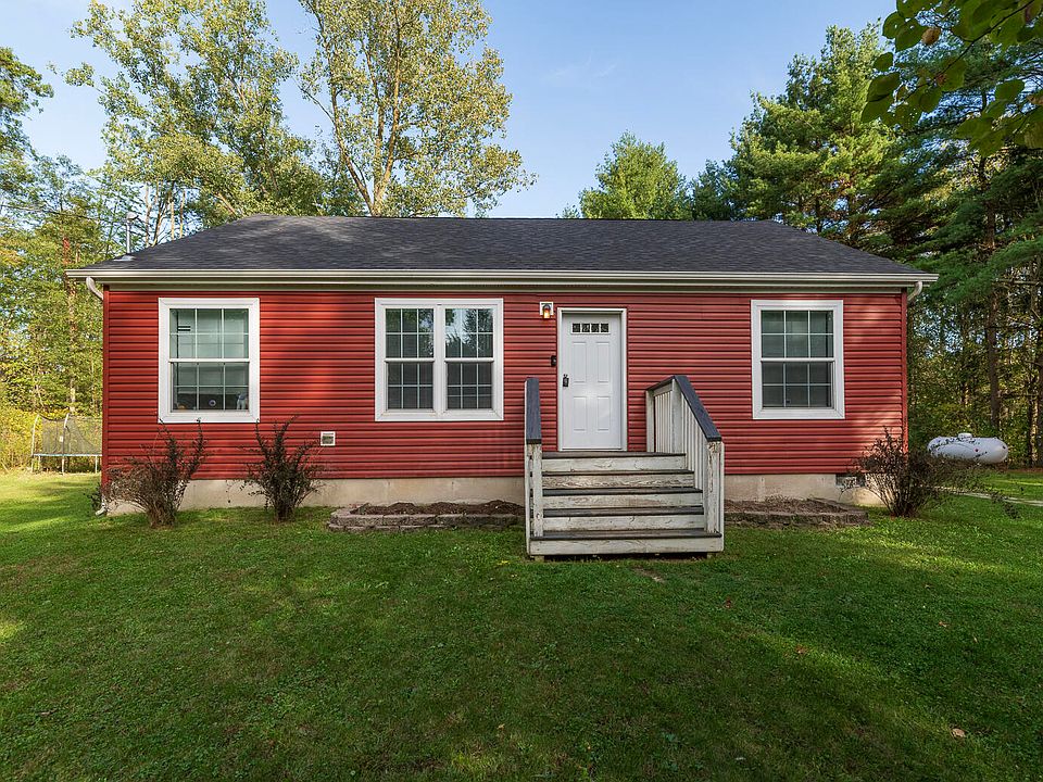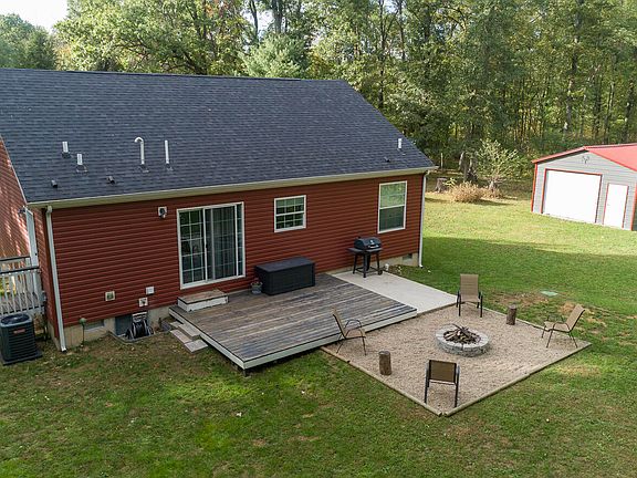 WELCOME HOME! This lovely country home is nestled in a peaceful, rural landscape. With 1.69 AC, you'll have plenty of space to enjoy those outdoor toys, nature walks, gardening & more!. NEW AC just installed! Built in 2019, this home offers 3 good sized bedrooms & 2 full bathrooms. The primary bedroom is an en-suite. The open floor plan is warm & inviting, with the spacious living room flowing nicely into the kitchen & dining area. There is ample natural light with the large windows in the living room & sliders off the kitchen. The sliding doors lead to a private back deck & firepit area, perfect for fall bonfires & smores! Surrounded by trees & nature, you will fall in love with the setting! The newer 18X25 garage/storage building has a cement floor, overhead door. There is also an additional storage shed that would be great for lawn equipment or just more storage. There is a small chicken coop, next to the shed, with electrical run to it. The fence surrounds most of the property. Don't miss the opportunity to own a newer, move in ready home in a peaceful setting! This home is available to all loan types.