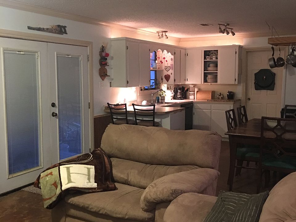 This is a 1,440 sq ft single family home on a slab with stained concrete floors throughout. The kitchen/living room area is an open plan coming from a front foyer. There are four designated bedrooms and two complete baths. There is another room that would be suitable for a bedroom, office, or even dining room. The main living areas are trimmed with stained bead-board, 5 1/4 base, and 4 1/4 crown. The home has central heat/air and ceiling fans. There is a porch across the front and a 12*12 porch covered by a 12*20 roof on the back. The home has heavy guage metal roofing and a wide parking area. The land is appx 1.9 acres.