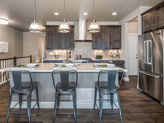 The gorgeous Willow model combines dark wood elements, industrial features and neutral gray tones to create a unique eye-catching environment. Light gray cabinets, flooring and railing posts are boldly contrasted by metal hardware, furnishings and light fixtures all of which are complemented by warm grey walls.Loaded with beautiful texture, this model delivers some serious visual impact. A herringbone backsplash, floor-to-ceiling herringbone patterned fireplace and variety of feature walls add intriguing character while also maintaining a cohesive neutral color palette.