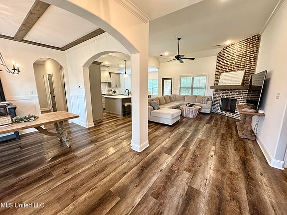 Step into comfort and style with this spacious 5-bedroom, 3-bath home offering just over 2,600 sq ft. A welcoming front porch sets the tone, while inside you'll find an open design filled with natural light. The kitchen is a cook's dream with a generous island that seats four, gas cooktop, built-in microwave and oven, and a classic white tile backsplash. The living area is anchored by a striking brick fireplace and wood mantel, perfect for cozy evenings. This home provides both a formal dining room with wood beam accents and a casual breakfast nook. The primary suite is large enough for a king bed plus furniture, and the spa-like bath features dual vanities, a soaking tub set in front of a walk-in shower, and a roomy walk-in closet. Other highlights include cubbies with hooks at the garage entry, laundry with a folding counter, a tankless water heater, and a walk-in attic for storage. Outdoors, the covered back patio offers a peaceful view of nature.