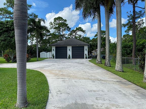 One story home on paved road with 1.25 acres, features solar heated salt water pool, attached 2 car garage, fenced yard, screened vegetable garden with two 36' x 4' raised beds, fruit trees galore and majestic Royal Palm trees lining the driveway! Also fully secured with aluminum hurricane shutters in every window. Bonus 2nd detached 50' x 34' garage/barn/ workshop with two 12ft doors, CBS construction, 60ft of workbench area, and shelving all around the garage area. Expanded driveway provides space for RV parking. Newer A/C and solar hot water heater. The house has a long lasting metal roof, large screened lanai with tongue and groove ceiling. 24" tile throughout. Stone and granite fireplace and window sills. Walk-in closets in all bedrooms. Master Suite features spa tub, marble floors & shower, and two walk-in closets.