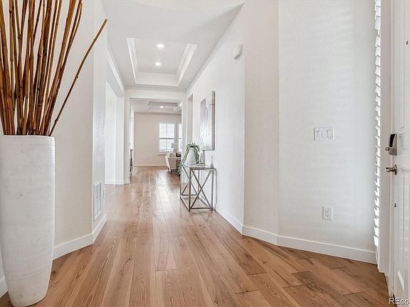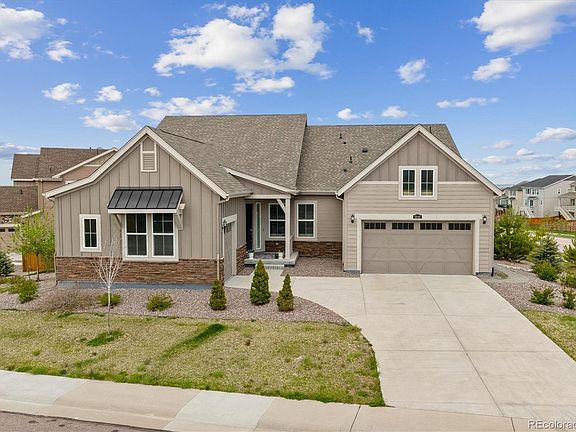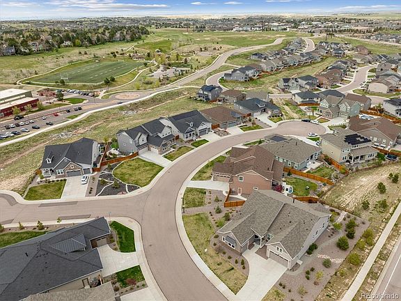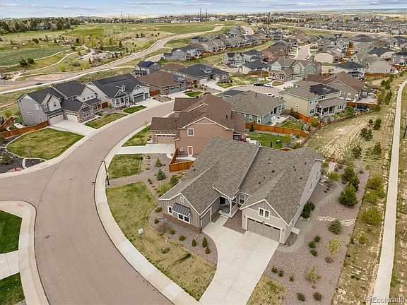 No Buyer`s Agent commission paid. Immerse yourself in luxury living in this stunning executive Lagae Ranch home in prestigious Castle Pines. Popular Ranch floorplan w/ample living spaces & elevated design touches throughout. Quiet cul-de-sac, SW-facing (less snow-shoveling!), 0.35-acre lot backs to open space; has low maintenance xeriscape backyard landscaping w/covered deck & lower stone patio! Enter to find extensive wide plank, engineered HW floors plus 10’ ceilings, Plantation shutters. Heart of the home is the highly appointed gourmet kitchen. Features: quartz counters & upgraded tile backsplash, large working island w/bar seating, double-stacked espresso cabinets w/molding, high-end stainless appliances include large built-in refrigerator, gas range w/hood AND dual wall oven & microwave. Sits between generous breakfast nook w/access to back yard & Butler’s pantry w/more cabinets, wine cooler, sizeable walk-in pantry. Substantial family rm boasts striking coffered ceiling, electric fireplace place w/stylish tile surround; formal dining room w/ bay window & space for large furniture. Relax in the Primary Suite Haven featuring tray ceiling & door to back deck. Spa-like, attached 5-pc bath has dual vanities & make-up counter, soaking tub, frameless shower, water closet. Bonus: vast walk-in closet w/ultra-convenient 2nd dr opening into laundry room w/sink, cabinets & folding counter! Bedroom #2 has private 3/4 bath & large walk-in closet; bed #3 has walk-in closet, located near full hall bathroom. Massive unfinished, full basement offers abundant storage; option to add more living space. Convenient split 3-car garage (2+1) gives more storage. Other Upgrades: Lennar Smart Home features, extra insulation, HVAC UV light filter w/hydrogen peroxide, builder’s warranty. Just steps to charter school, Elk Ridge Park & trails, feeds to top-rated Rock Canyon HS/DougCo Schools. Easy to I25, close to CR outlets & Park Meadows Mall, Sky Ridge Hospital, shopping/dining/services.