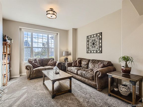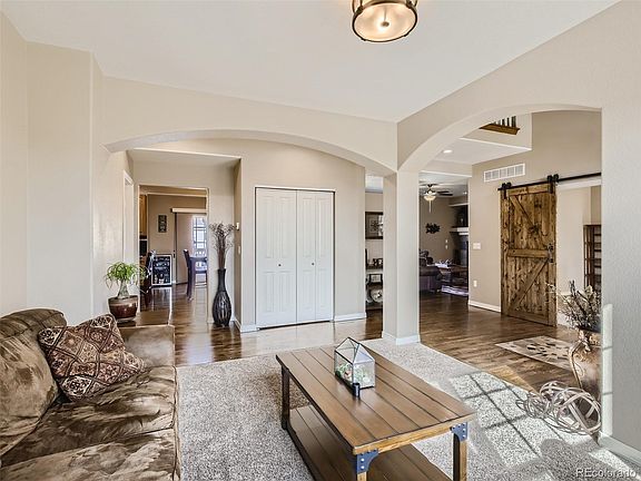 Stunning home in the highly desirable St. Vrain Ranch community of Firestone on a huge lot! From the moment you arrive, you'll appreciate the home's curb appeal and covered front entryway. As you step inside, you'll be greeted by an inviting open floor plan with beautiful wood flooring throughout the main level. The front living room is bathed in sunlight, creating a welcoming atmosphere. Additionally, there's a spacious office with bay windows and charming barn door entry. The main living room features a cozy gas fireplace and seamlessly leads into the dining room, which boasts a stylish wood accent wall and sliding glass doors that open to the patio. The kitchen is a true chef's delight, complete with stainless steel appliances, a kitchen island with seating and a cooktop, and granite tile countertops. For added convenience, there's a 1/2 bath and easy access to the attached 3-car garage on the main level. Upstairs, the primary bedroom suite is your private sanctuary. It includes a balcony where you can enjoy your morning coffee and a luxurious 5-piece en-suite bathroom. An additional bedroom off the primary suite offers versatility in another bedroom or flex room. Three more spacious bedrooms and two additional bathrooms complete the upper level. The basement provides additional living space with a recreation room, bedroom, and a 3/4 bathroom. Stepping outside to the large fenced-in yard, you'll be delighted to find a spacious deck, stunning landscaping, and mature trees, creating the perfect outdoor oasis. The neighborhood greenbelt trail is accessible from the gate near the rear fence line, and leads directly into the trail and parks throughout the community, perfect for morning and evening strolls. The home also boasts a whole house humidifier as well as fresh interior and exterior paint, adding to its fantastic condition!