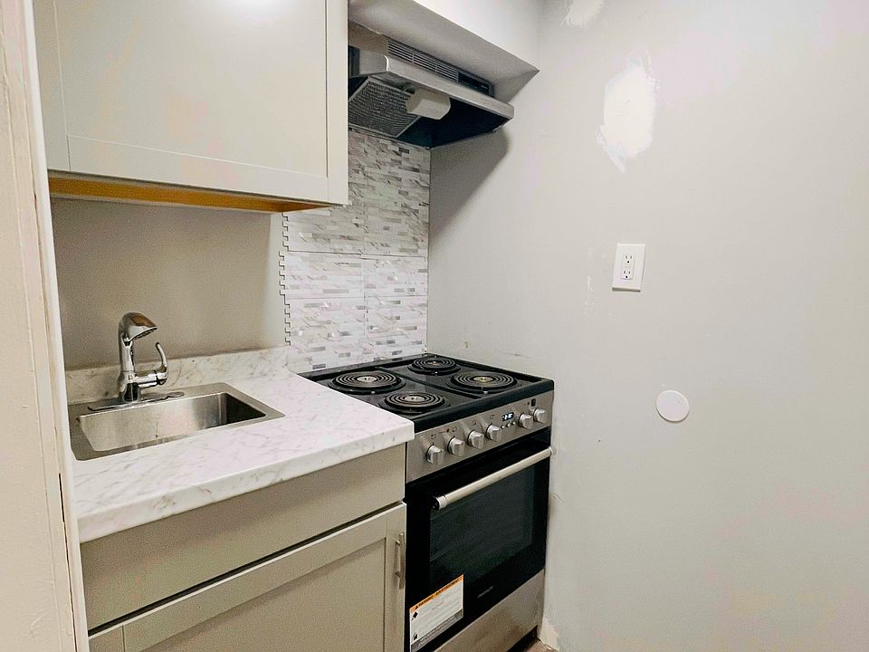 Large studio, with full bathroom and small kitchen area .Parking right in front of the unit . Utilities are split between the upstairs tenant .This also has a huge garage area that you can use if you choose to for $200 more a month . Owner pays for trash and lawn maintenance