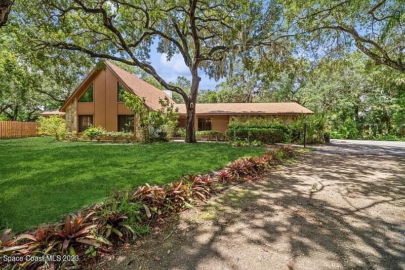 This spacious home is tucked away in South Merritt Estates nestled on 1.32 acres w/natural Florida landscape offering privacy & serenity. This 3 bd 2 ba home has an oversized 2 car garage, an ensuite & guest suite that access the Jack-n-Jill bathroom. The Great Room is accentuated w/cedar A-frame cathedral ceiling & stunning white marble wall surrounding the wood burning fireplace. Separate dining room off kitchen to enjoy large gatherings. EXTRA 2 car detached garage w/carport & paved driveway has plenty of room for a large RV or boat. Members of the voluntary HOA have access to the Community boat ramp, dock and fishing pier. Centrally located close to schools, shopping, restaurants, cruise lines, Port Canaveral & Cocoa Beach. 42 miles, Orlando IA, 60 miles, Daytona Speedway!