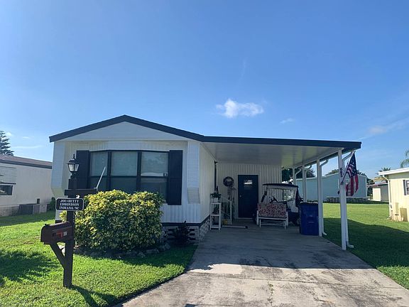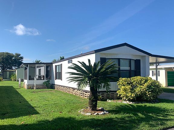 Being offered turn-key ready, lot 685 offers 924 sq.ft. of spacious living with a sought after split floor plan ideal for your guests. Boasting new carpet throughout the living spaces with new wood-style flooring in the kitchen. The kitchen features ample cabinet space as well as an area large enough for a home office/dining space. There is a sunny raised lanai off of the kitchen perfect for al fresco dining! Heading back towards the primary bedroom there is a convenient in-home laundry center with yet more storage! The owner's suite features a new king bed, walk-in closet and a large bathroom with a walk-in shower. Both bathrooms are inviting and well-appointed with modern fixtures. With an 8 year old roof, a long driveway, and a golf cart shed that offers additional storage and a chest freezer, this is a must see home! Situated on a quiet street in the lovely retirement community of Hidden Golf Club along the shores of Lake Henry. Enjoy pickle ball, tennis, golf, on-site pub, heated pool, and great neighbors! Call Christina today to schedule your showing!
