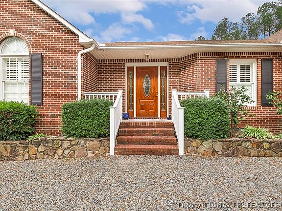 Charming all-brick home located in the gated and golf community of Carolina Trace. This home offers plenty of natural light with beautiful custom plantation shutters, real hardwood floors in the main livening space, crown molding, and ranch styled split floor plan. The kitchen offers a nice-sized eat-in kitchen with a spacious pantry and solid surface countertops. The large formal dining room shows off beautiful wainscoting. Large primary bedroom with plenty of room for a king-sized bed and 2 end tables, and a walk-in closet. Double vanities, jetted tub, and separate shower. 2 additional bedrooms and full-size bathroom. Side entry garage, additional parking spaces, lovely landscaping, and an outside patio. This POA offers a community pool, pavilion, and pickleball.