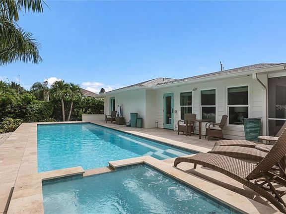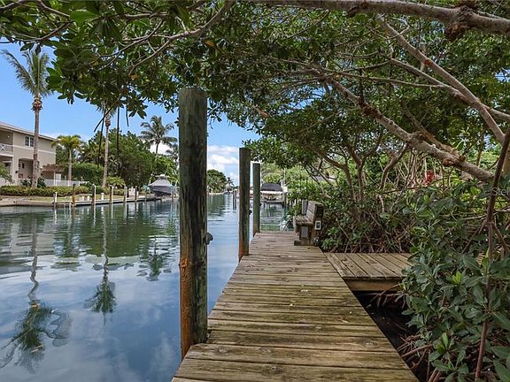 Coastal canal front. Casual island living in one of the island's best family neighborhoods. This home has been beautifully renovated in coastal casual, featuring an open floor plan, large pool with spa, gorgeous tropical landscaping and private dock on sailboat depth water. Enjoy the Gulf beaches with deeded access just steps away, boating with direct access to Sarasota Bay and the Gulf of Mexico, amazing kayaking around Sister Keys and Greer Island, and entertaining on your 60-by-25-foot travertine pool deck or splashing in your 40-foot heated pool and spa. Features and extras abound everywhere, from the Pentair Whisper quiet pool equipment and EasyTouch control panel, to the new high-efficiency air conditioner with UV purification; the HE front-load washer and dryer with pedestals; custom plantation shutters; ceiling fan pre-wires in every room; impact windows; hurricane garage door with Overhead brand super quiet door opener; Hague whole-house water softener; and whole-house gas Generac Guardian generator. The kitchen features white wood cabinets, quartz countertops, stainless steel appliances, deep bowl stainless sink and reverse osmosis water filtration. Professionally designed and installed landscaping for ease of maintenance featuring irrigation, lighting, palms and tropicals. Water views abound from virtually every room. The screened Florida room adjoins the pool deck and is perfect for those summer evenings, reading a favorite book, or catching a Saturday football game. Spacious kitchen opens to the family room and dining areas. Separate living or TV room great for gathering. Master bedroom with walk-in closet, large walk-in shower and dual vanity. Open study with plenty of desk space for two. The two guest bedrooms are split from the master and share a full bath. One guest bedroom overlooks the pool deck and canal, the other has two twin beds. Double-car garage with a split A/C system. The dock has electric and water and plenty of room for a boat lift. New roof in 2005, new A/C in 2016, new impact windows in 2016, new electrical panel in 2018, and new pool, spa and equipment 2018. This truly is casual coastal island living at its very best.