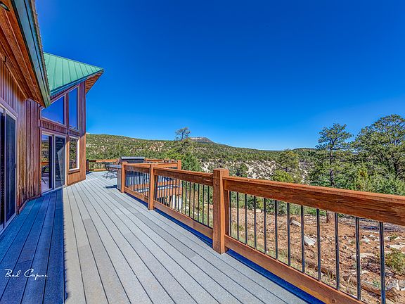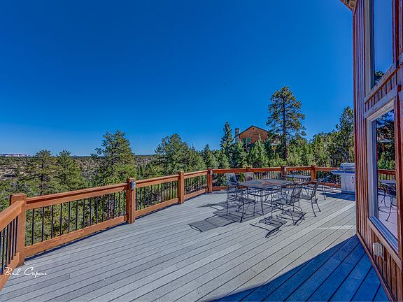 Cabin home located in a gated community just outside Zion National Park with amazing views and is adjacent to Zion Ponderosa Ranch with access to all of their amenities and activities. Relax into the evening on the wrap around deck with its well-appointed lighting. Beautiful woodwork, two story fireplace, gourmet kitchen with granite countertops, new range, Bosch dishwasher, pantry and oversized laundry. Two master bedrooms with walk-in closets, both with access to the deck. Bose surround sound system. Two separate zoned AC units. Great get away home or continue to keep as part of the vacation rental pool. Furniture included.