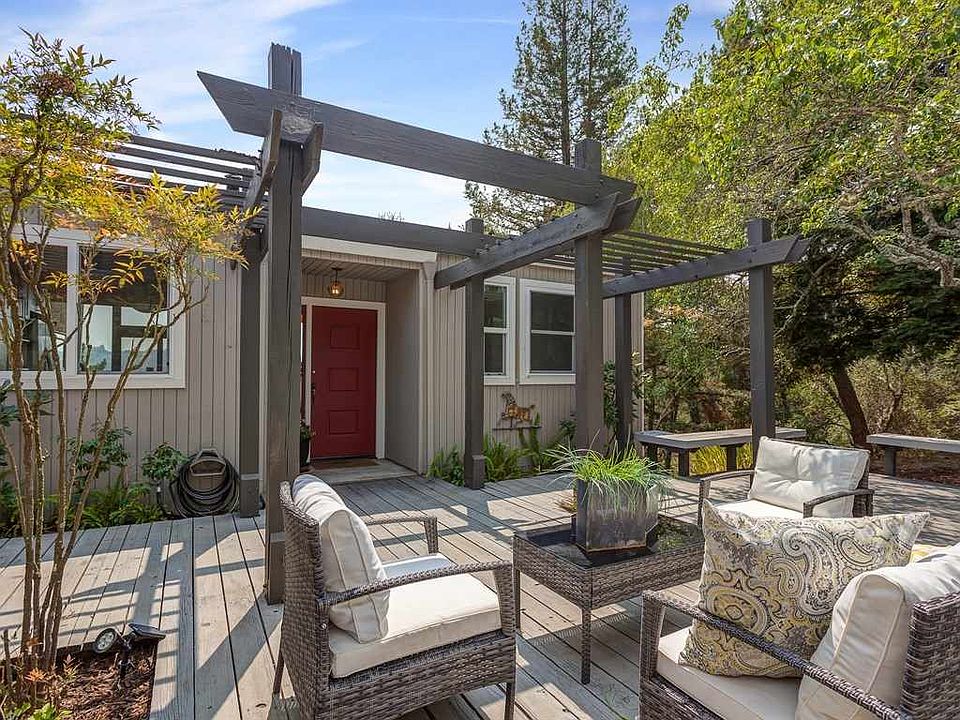 Dramatic, classy contemporary home with wonderful artistic wall of glass overlooking rolling hillsides beyond. Sunny remodeled kitchen with granite counters, hardwood cabinets and designer appliances. Cozy gas lit fireplace hardwood floors and vaulted ceilings with vertical skylights accent this classic California living home. downstairs features 3 bedrooms, Berber carpeting and 2 baths remolded with granite, tile and lighted vanity closets. Each bedroom features sliding door leading to private patios and balconies. the lovely balconies overlook the large level landscaped yard below.
