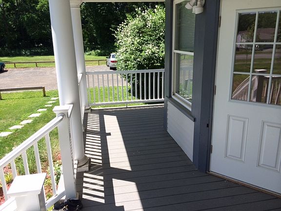 Beautiful South Amherst apartment high ceilings lots of closet space lots of light convenient first floor includes new windows. Large updated kitchen with laundry. Hardwood floors porch new interior and exterior paint vinyl kitchen floor new light fixtures and updated electric service nice landscaping. Layout 3 bedrooms 2 larger than the third large eat in kitchen living room and one bath all on first floor. $300 additional rent if 4 people. Bus stops in front of house (literally) borders Hampshire College. 4 possible parking spaces plus some storage area allocated in barn. Set back from road quiet with woods surrounding house and farm to the south. Less than 1/2 mile to South Amherst village center with stores and services.