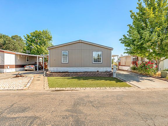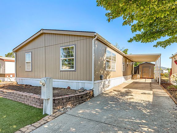Beautiful 3 BD, 2 BTH mobile nestled in the heart of Central Point with stunning views of the sunrise & sunset! A partially enclosed front porch greets you as you walk up & offers a cozy & inviting atmosphere when entering the home. Once inside, this lovely home offers 1512sqft of ample living space with a large living room, cozy family room & incredible kitchen! The kitchen is both expansive & inviting! With its generous size, this culinary haven boasts ample counter space, stylish cabinetry, & a breakfast bar overlooking both the eating area & family room! This living space effortlessly blends style & comfort. The bedrooms are each good size & offer plenty of natural light with the primary bedroom boasting two closets & a beautiful full bathroom. Step outside into the spacious backyard, a true haven for outdoor enthusiasts with plenty of room for gardening or entertaining guests! Exterior also includes a large shed & attached carport. View this beautiful home today!