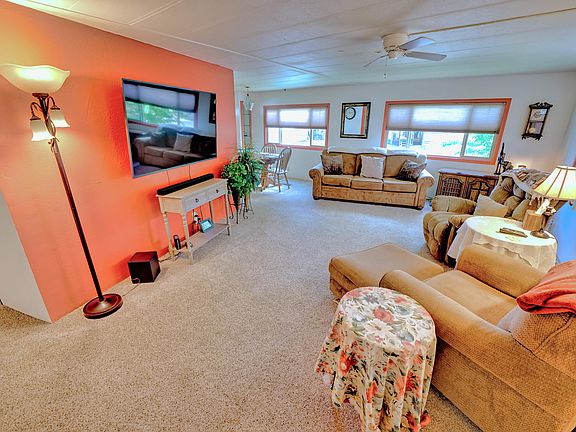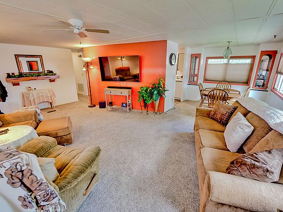 Charming, Clean and Comfortable. This home has been lovingly cared for & well maintained inside and out. Many newer upgrades have been completed, with vinyl windows, heat pump, kitchen appliances and much more. All appliances stay with the home, including the refrigerator, washer & dryer. Furniture is negotiable. Home features a little breakfast counter in kitchen, newer vinyl floors, nice carpet, lots of storage. 2 large sheds outdoors wIth beautiful lawn and shrubs. In ground sprinklers front & back. Located in a quiet family park.
