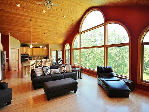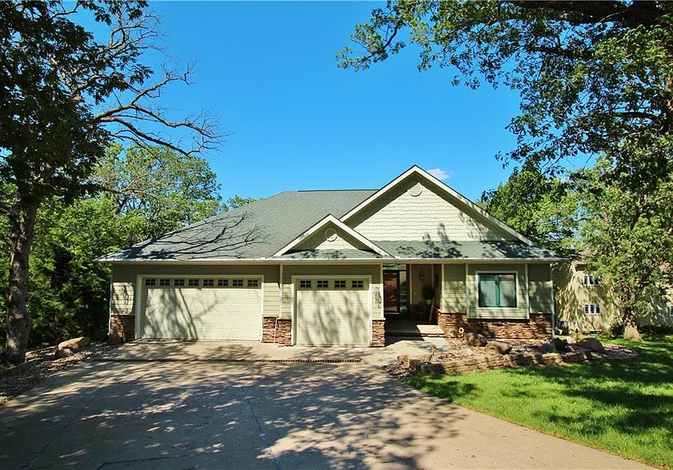 Ready to entertain your crew at the lake? Check out this architectural beauty, tucked away among mature trees on a quiet cove on the lake's west side! Prepare to fall in love with the privacy and livability of this large home (over 3,800 finished sq ft!) with six beds/three baths and tons of storage. The indoor/outdoor feel is amazing, highlighted by a stunning wall of windows and vaulted ceiling in the great room. WOW! The finishing details are too numerous to list, but include knotty wood ceilings, granite counters, stone FP, light maple floors, cabinets and trim. Even lakeside you'll have it "made in the shade" or sun, depending on your preference. The paved path and steps make lake access easy, and you'll appreciate the calm cove waters. The cantilever dock, cut stone patio and bonfire area are all you need for perfect summers at the lake, so start making your party invite list now!