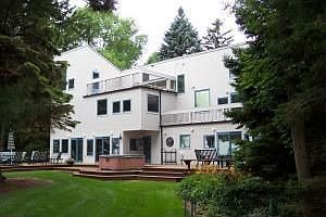 Spectacular lake views. 175 ft. private Lake Michigan sandy and level beach. Unique three- story contemporary house design- includes two large upper deck outdoor balconies facing Lake Michigan. Mature trees and well-maintained gardens surrounding grounds- large lot. Winding concrete driveway leads down to separate coach house by access road. Large cedar deck wraps around house and faces Lake Michigan.